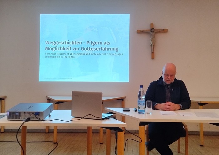 Am Mittwoch, den 25. Februar 2026 fand unser erster Fastenimpuls im Gemeindehaus Sankt Severi statt. Herr Diakon Thomas Kappe hat uns eingeladen, mit ihm zu pilgern. In seinem sehr gut gegliederten und kurzweilig vorgetragenen Beitrag führte er uns zuerst durch das Alte Testament. Dort war Pilgern immer etwas Verbindendes mit Gott und Identitätsstiftende mit der Gemeinschaft. Das Pilgern im neuen Testament und das Pilgern im Mittelalter hat andere spirituelle Aspekte. Den Abschluss bildete das Thema Pilgern heute. Neben den klassischen Pilgerwegen zeigte er uns die Wege in Thüringen auf. Gut fand ich auch die Einladung zum „Pilgern und Wallfahren", zu dem das Bistum Erfurt im Jahre 2026 einlädt.