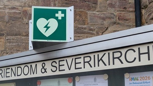 Erste Hilfe bei Herzstillstand auf dem Domberg: Zwischen Dom und Severi-Kirche wurde jetzt ein Automatisierter Externer Defibrillator (AED) fest installiert, um im Notfall schnell und lebensrettend handeln zu können. Durch den Standort zwischen beiden Kirchen ist das Gerät optimal zugänglich.